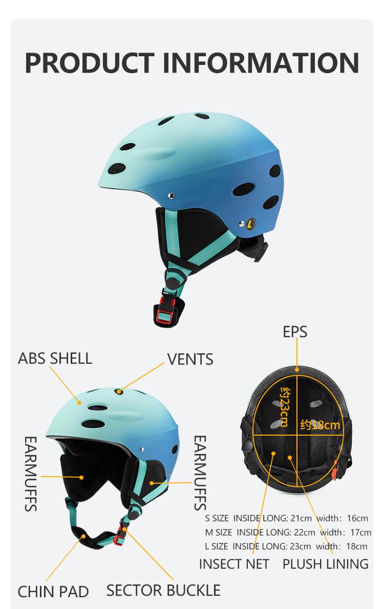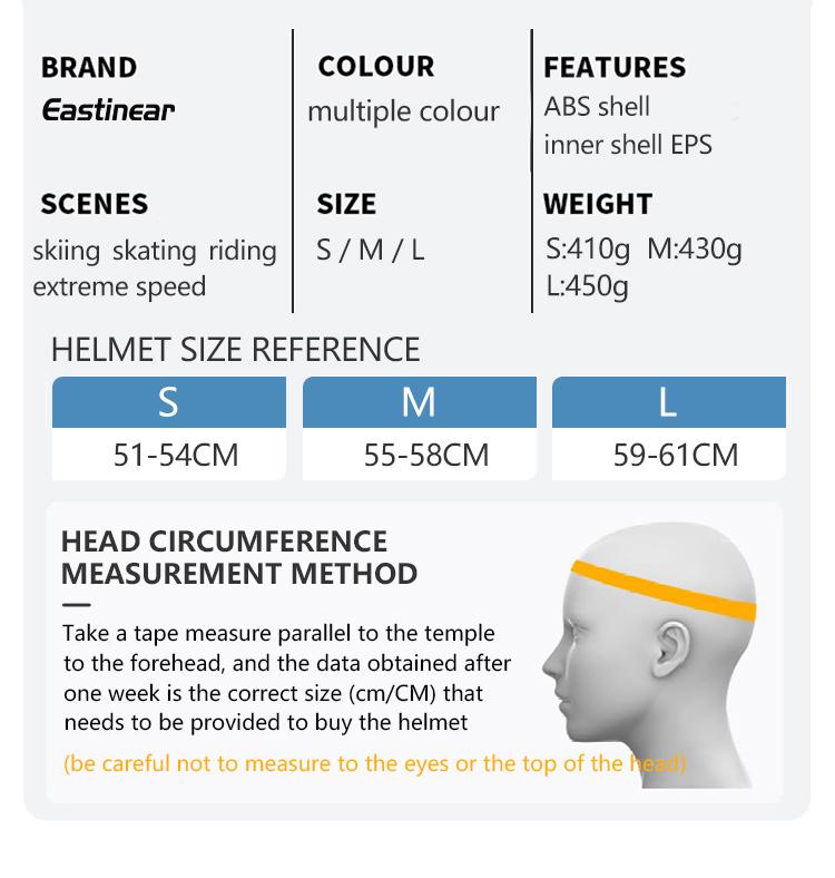 Eastinear's unisex ski helmet is perfect for men, women, and children. It offers high protection with a thickened design. The helmet features vents for better heat dissipation. Available in sizes S (51-54cm), M (55-58cm), and L (59-61cm). Weights are S/410g, M/430g, and L/450g. The exterior is ABS, and the interior is EPS. Integrated molding ensures safety.